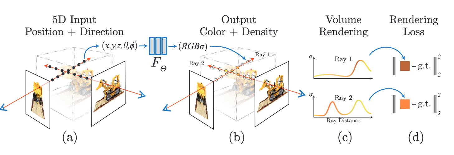 - Use classic volume rendering techniques to accumulate the output colors and densities into a 2D image.